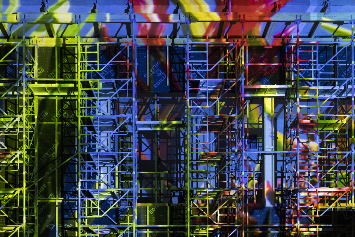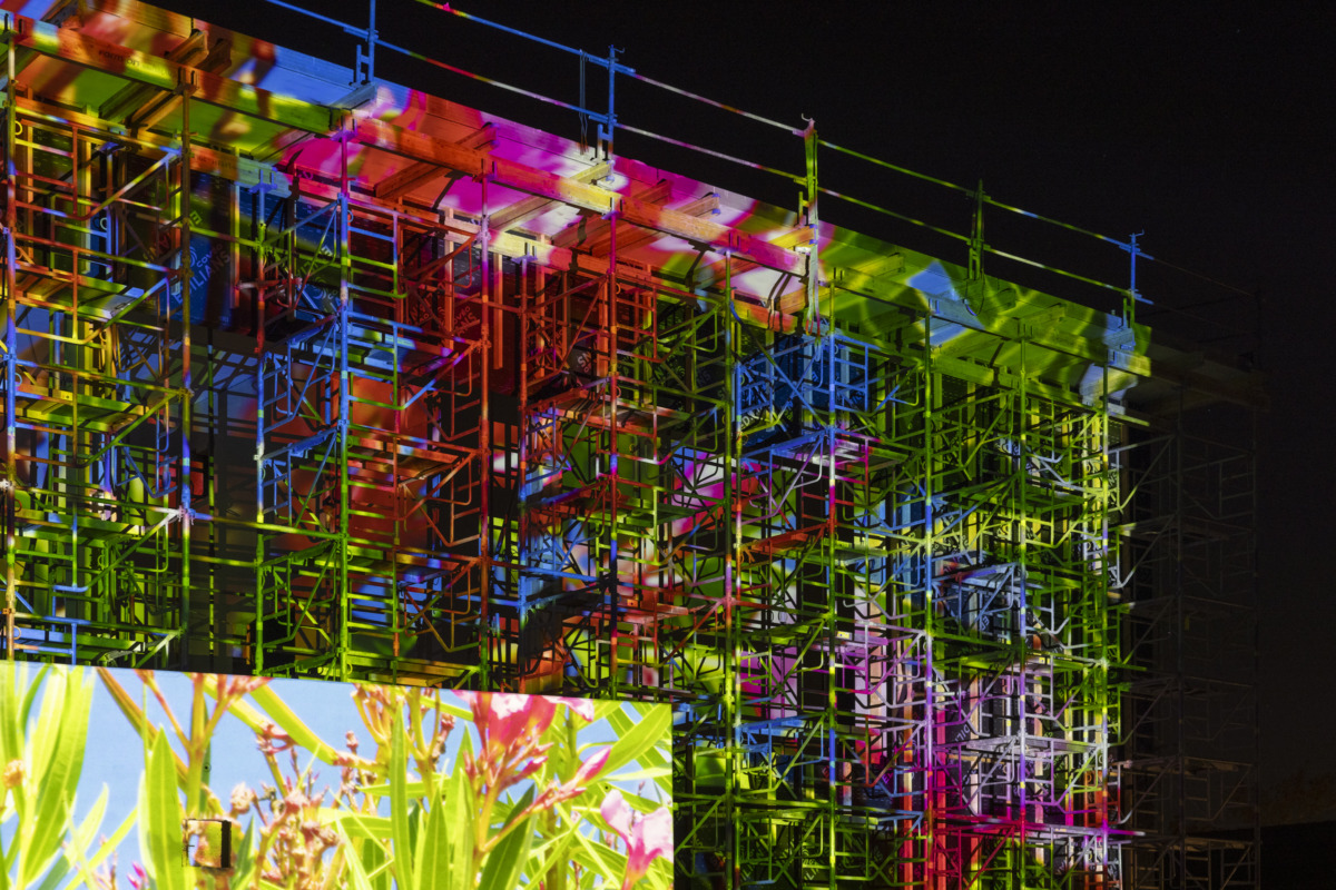 Projection des mains des spectateurs sur le bâtiment , filmées pendant le dernier concert avant travaux.