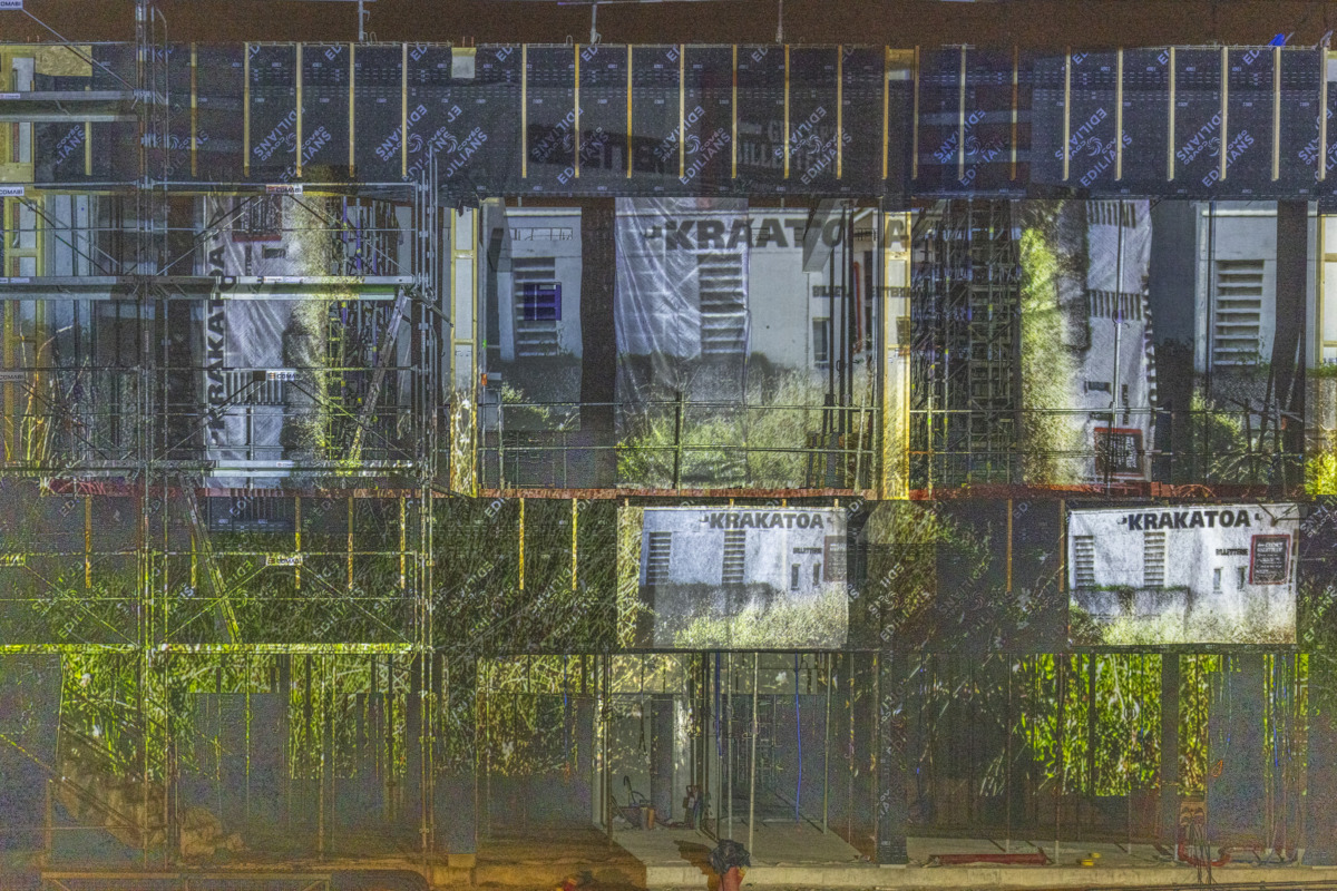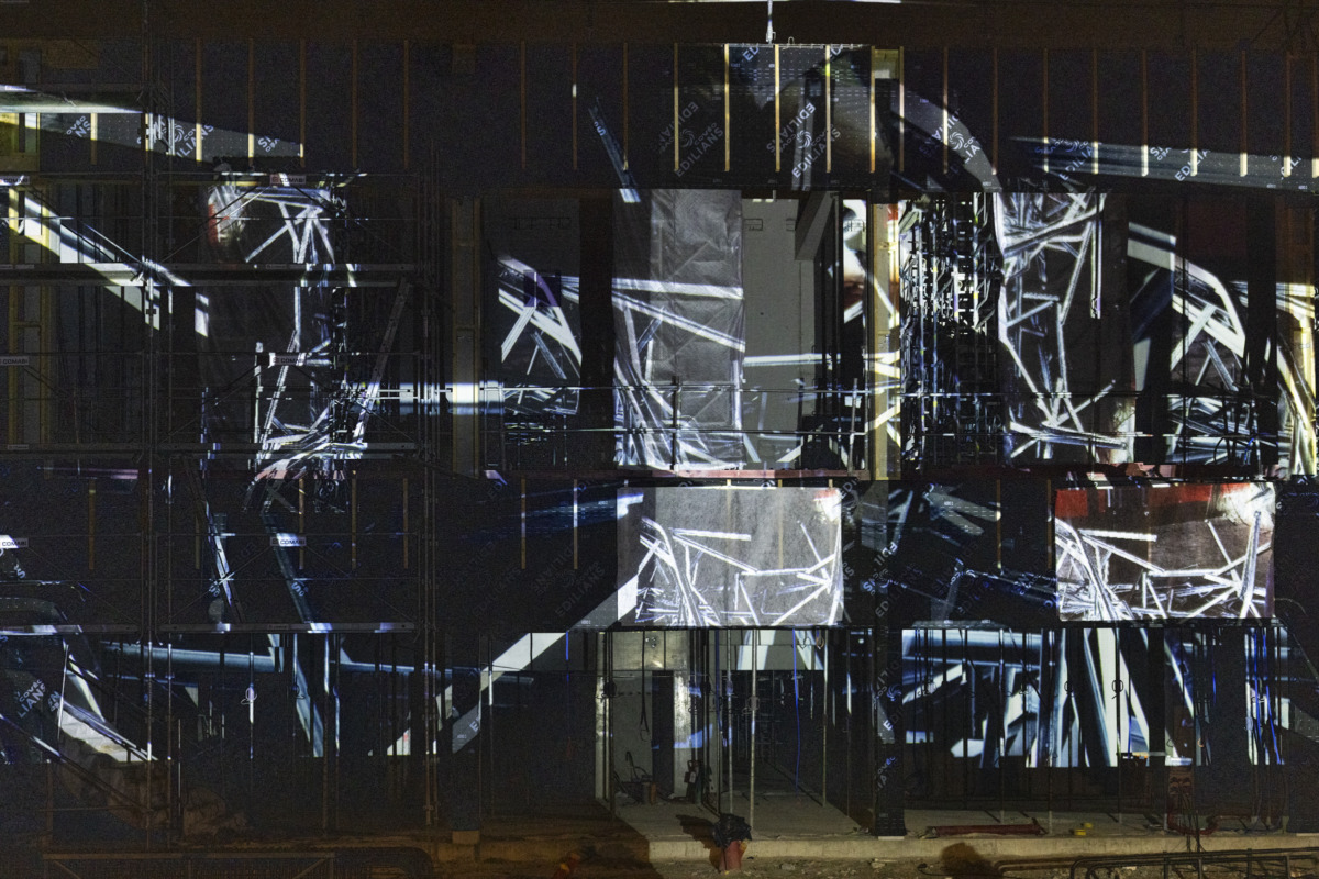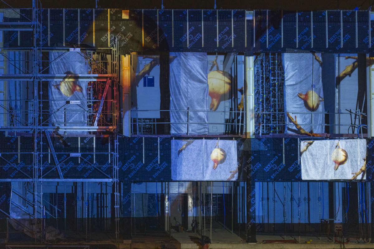 Projections au blanc sur le bâtiment.